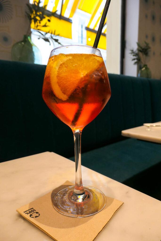 Monsieur a dégusté un Perlamatta Spritz (9€), composé de Martini Fiero 4cl, Prosecco 6cl, eau Gazeuse 6cl et orange. Il a trouvé son cocktail frais et délicat. Pour ma part, j’ai choisi le virgin mojito (6,50€), qui était frais, agréable et bien citronné.