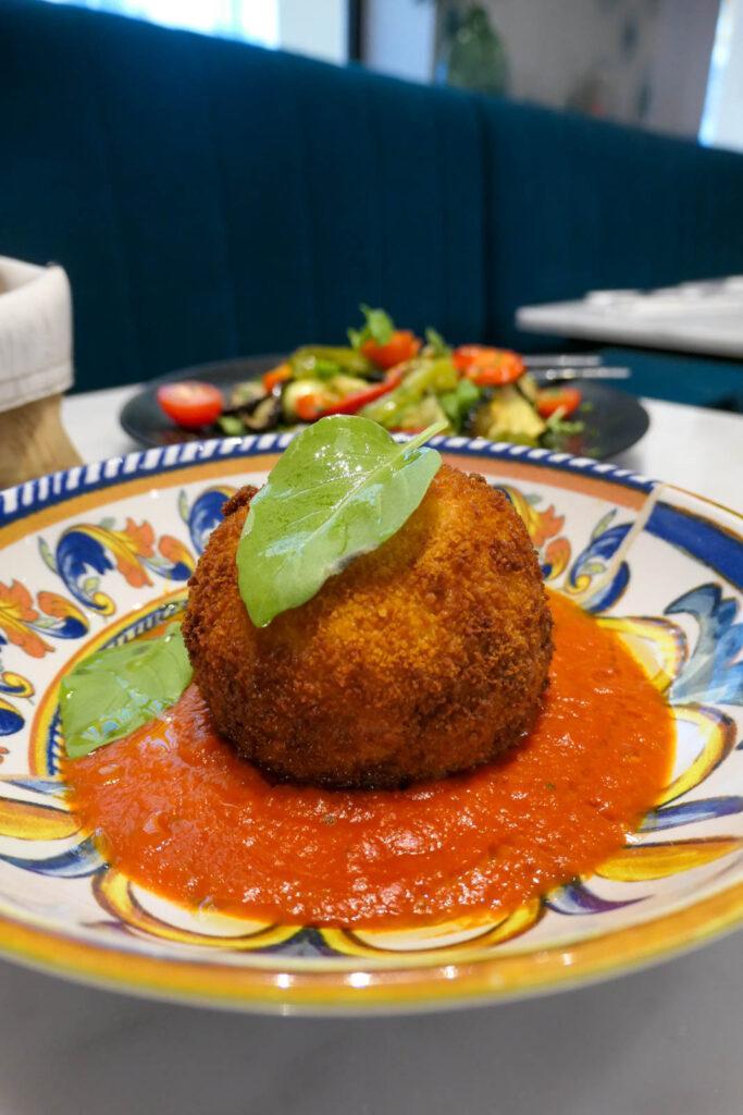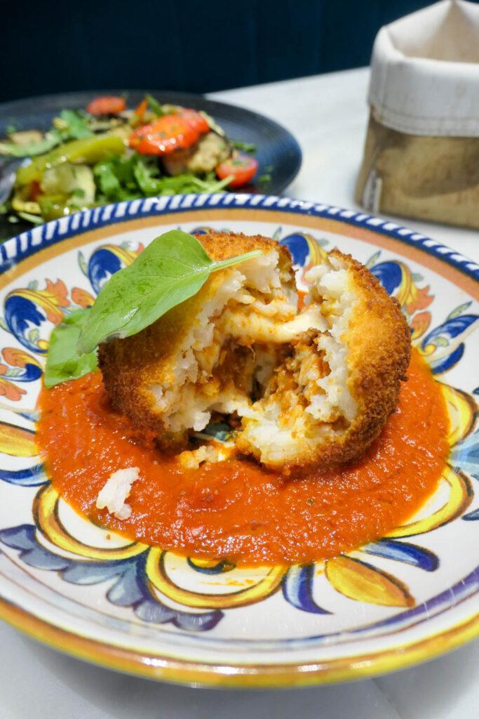 Moi qui ai gardé un très beau souvenir de mon voyage en Sicile il y a déjà 12 ans, je suis ravie de voir des anracini à la carte à Paris. Chez Perlamatta, j’ai donc choisi l’arancini « boulettes de tendresse® » (9€), une boulette de riz dorée farcie au Ragù, croustillante à l’extérieur, servie sur son lit de sauce tomate, avec du fromage fondu. Il est servi chaud et mis en valeur par une sauce tomate qui a beaucoup de goût. La garniture est vraiment douce et gourmande. Miam !