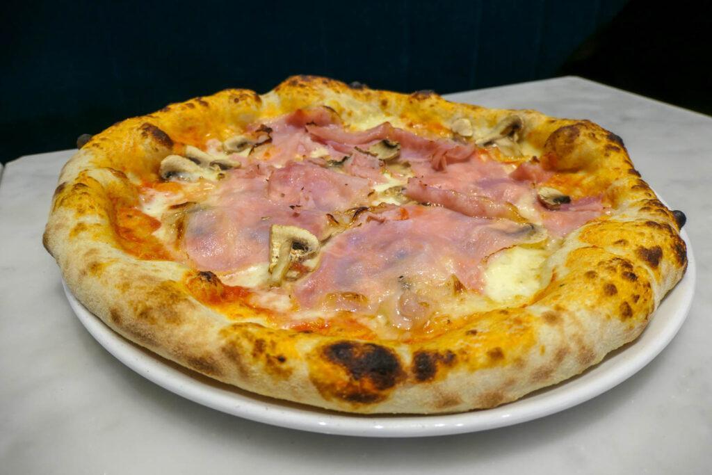 J’ai choisi de déguster une pizza : la Regina di Perlamatta (16€), garnie de sauce tomate basilic, jambon cuit au torchon du maître charcutier Gombitelli, mozzarella fior di latte et champignons de Paris. Fine et moelleuse, la pâte est très bonne. Le jambon était délicieux. L’ensemble est savoureux et gourmand.