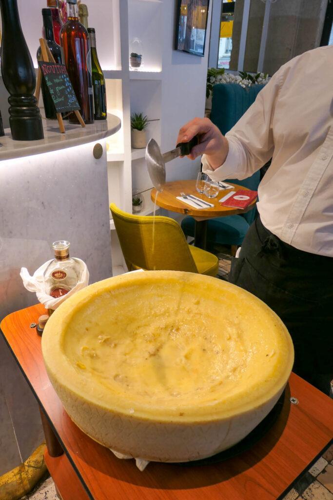 C’est aussi un plat dont la préparation est spectaculaire puisque les tagliolini, une fois préparés en cuisine, sont apportés au centre du restaurant et déposés au creux, préalablement flambé (au whisky, pour Monsieur), d’une meule de grana padano !
